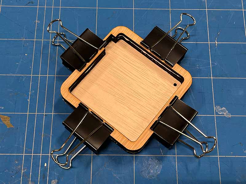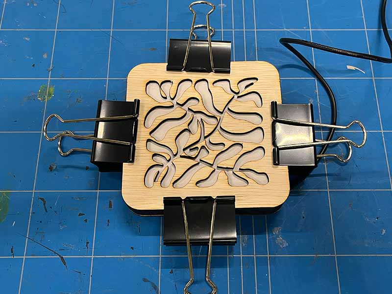 - Lijm de voorkant op de lamp. Gebruik klemmen om het op zijn plaats te houden terwijl de lijm droogt.