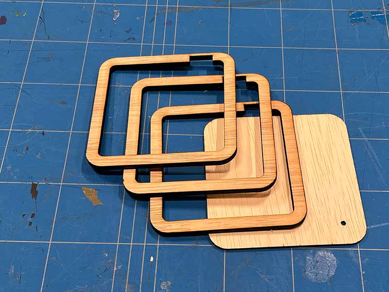 - Snijd het sjabloon uit 3mm en 5mm multiplex met de lasersnijder.