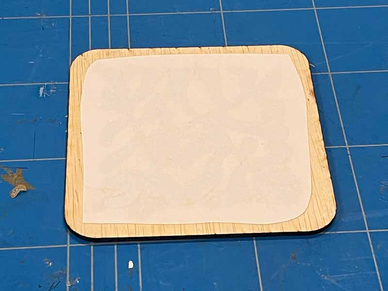 - Spuit wat lijm op het hout en plak het papier op wat de binnenkant van de voorplaat wordt.