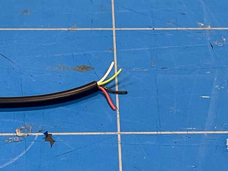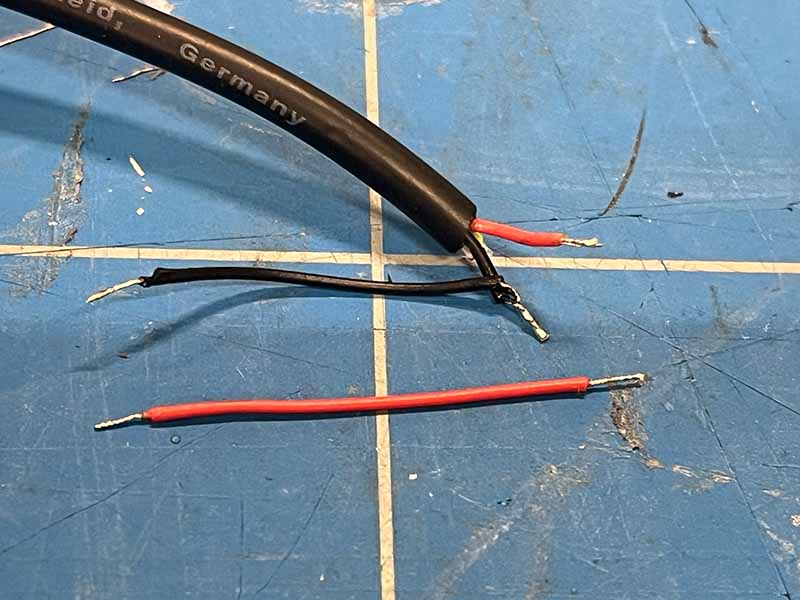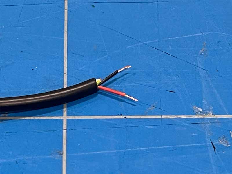 - Strip de buitenste isolatie van het uiteinde. Er kunnen tot 4 draden in zitten. We hebben alleen de rode en zwarte nodig. Strip de uiteinden van deze draden en knip de rest weg.