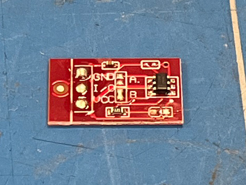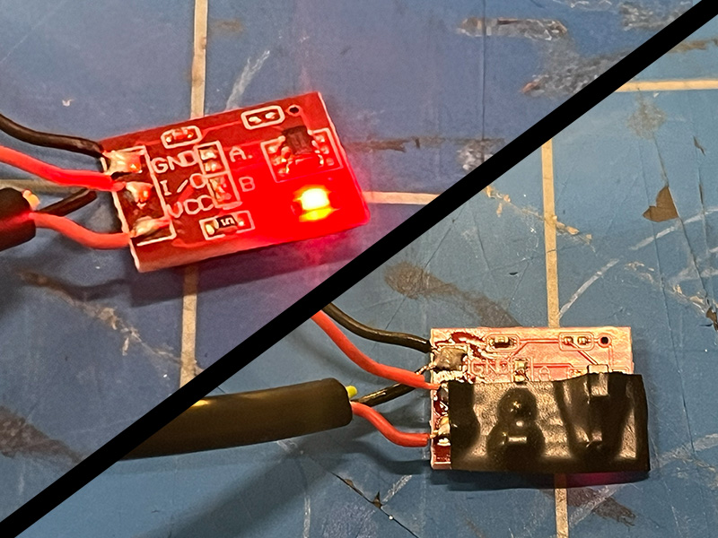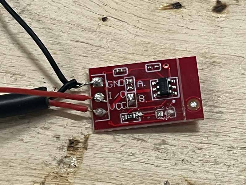 - Soldeer het korte stukje rode draad aan de I/O-pad van de aanraaksensor.
