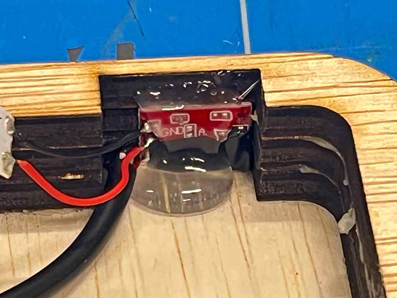 - Lijm met het lijmpistool de sensor in de uitsparing. De tekst 'TOUCH' moet naar buiten wijzen.