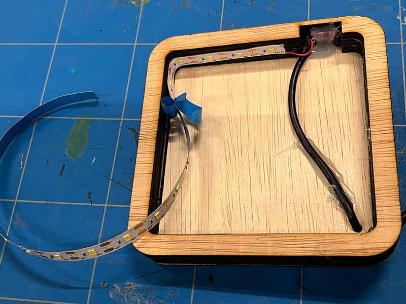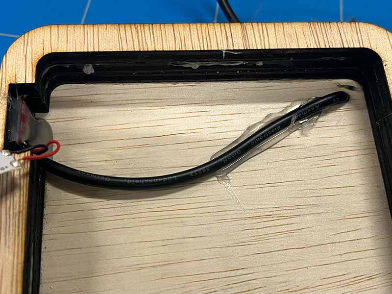 - Gebruik het lijmpistool om de kabel aan de achterplaat aan de binnenkant van de lamp vast te zetten. Dit voorkomt schaduwen en werkt als trekontlasting.