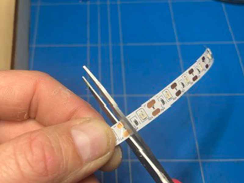 - Knip de LED-strip zodat deze in het aangegeven vakje past. (6 LED's). De strip geeft aan waar je hem kunt knippen.