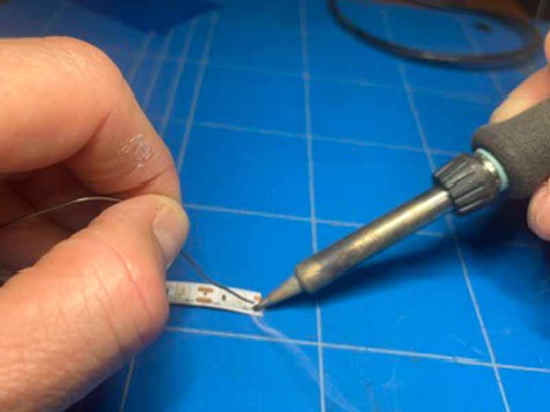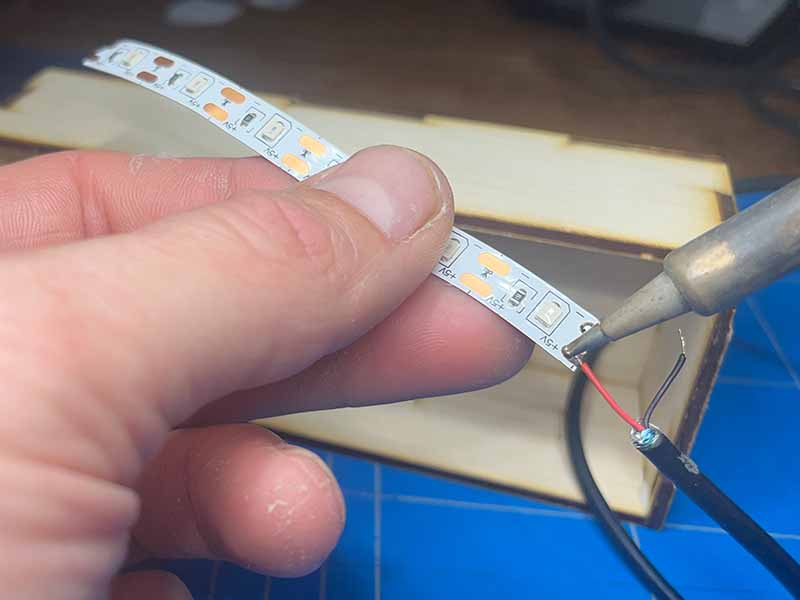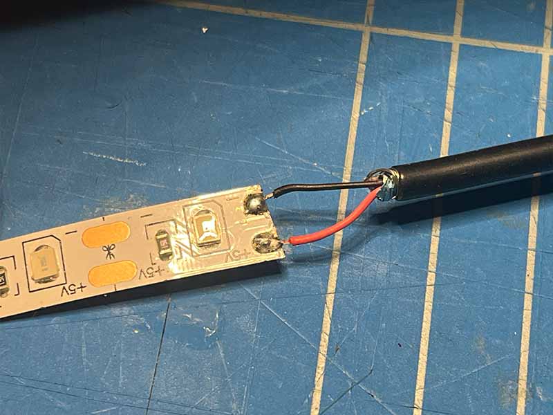 - Doe een beetje soldeertin op de + en - pads van de LED-strip.