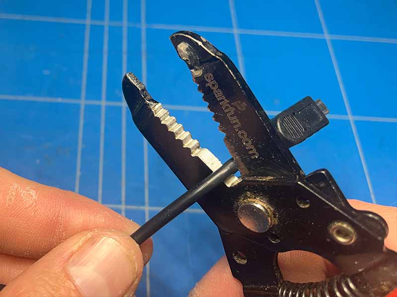- Strip een klein stukje isolatie van de rode en zwarte draad en tin de uiteinden.