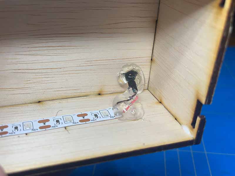- Doe een beetje lijm op de soldeerverbindingen en op de plek waar de kabel het kistje binnenkomt.