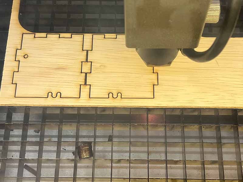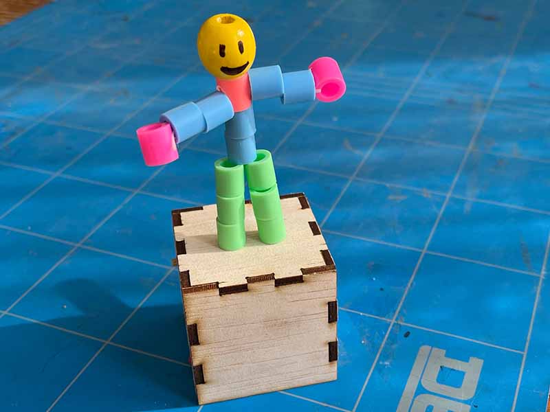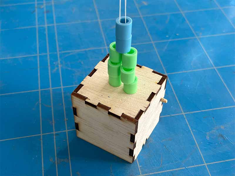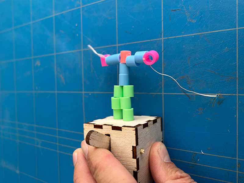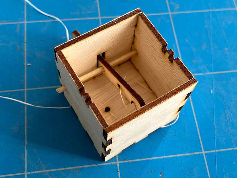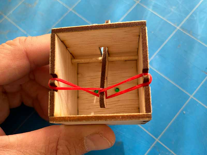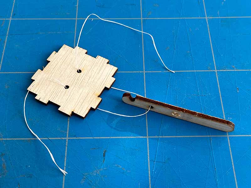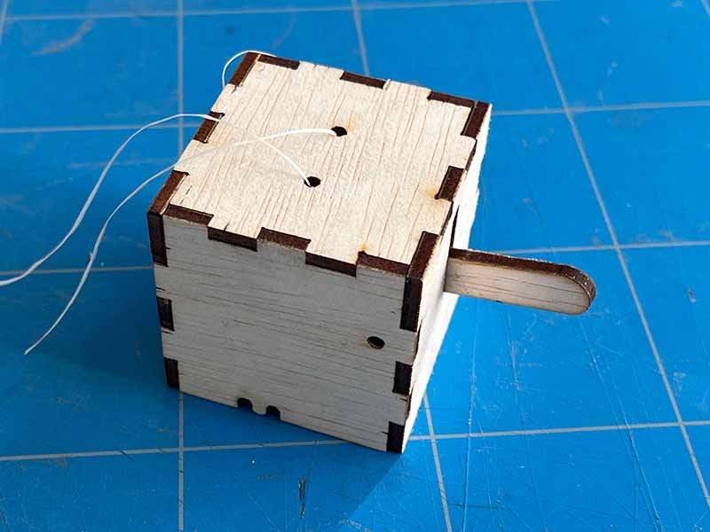 - Knip een sateprikker op maat en steek deze door de gaatjes aan de zijkant en de hefboom.