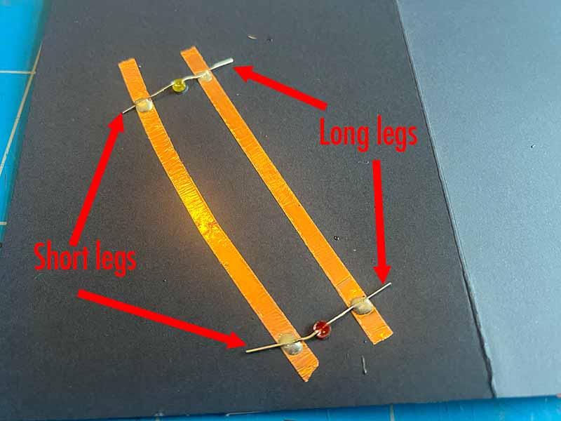 • Place the LED's trough the holes and bend the legs so that they touch the copper tape. Make sure all the long legs are attached to the same path of copper tape.