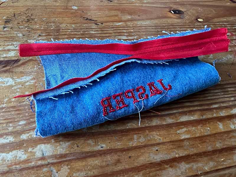 • Vouw het bandje en plaats het aan de zijkant in de zak. We willen het vastnaaien als we die kant sluiten.