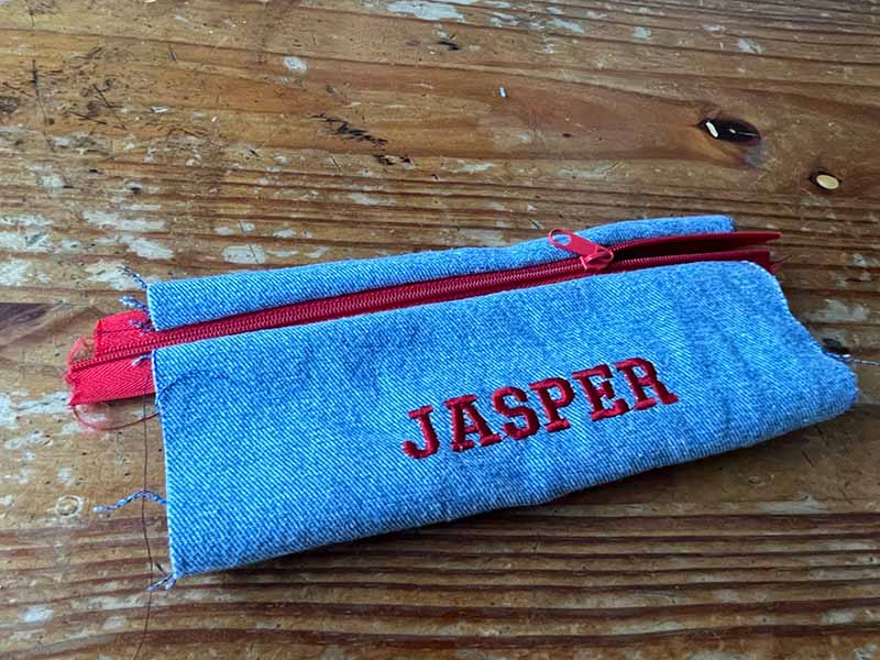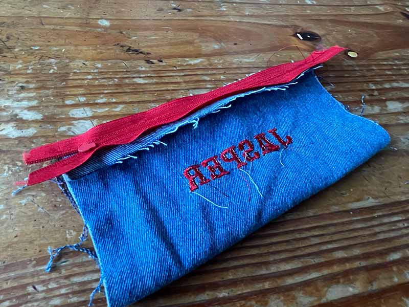 • Vouw de rits en de stof zodat de ritstanden nu naar buiten wijzen. Naai opnieuw, vanaf de buitenkant van de etui. Probeer een rechte lijn te maken en zorg ervoor dat je de stof van de rits in de naad meeneemt.