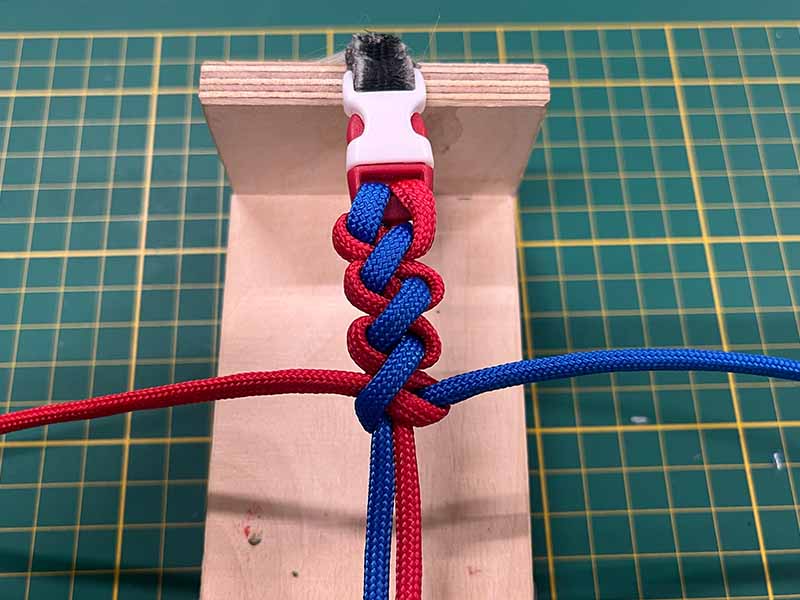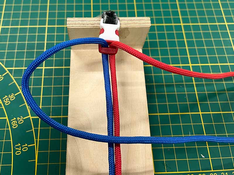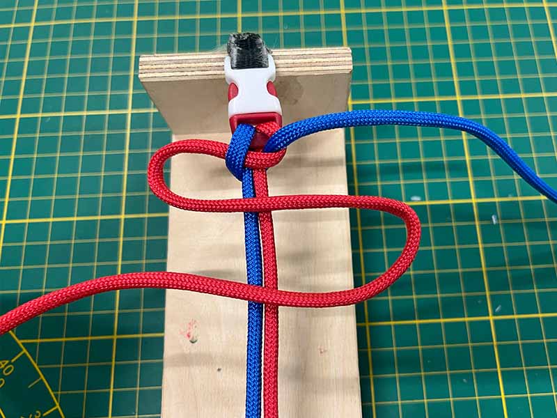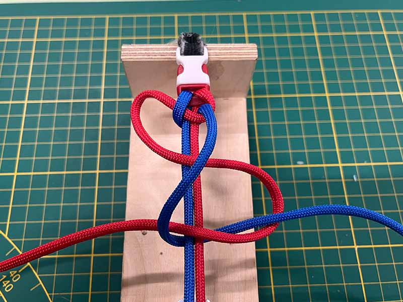 - Neem het touw dat links uitsteekt en maak een lus over de 2 middelste touwen.
