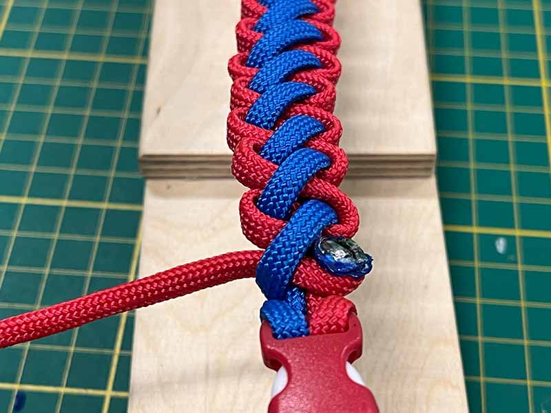 - Neem het andere uiteinde. Leg het omlaag over de eerste kleur, dan onder de 2 middelste touwen en door de lus van de eerste kleur weer omhoog.