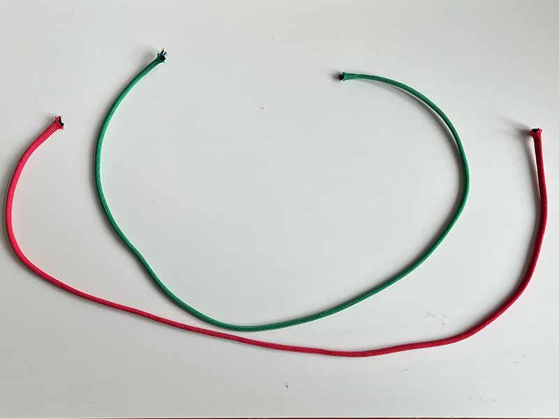 - Voor een sleutelhanger van 7cm, snijd twee stukken touw van ongeveer 60cm elk.