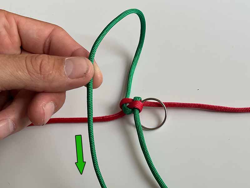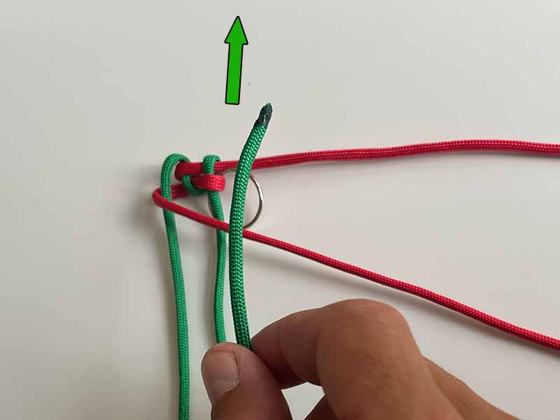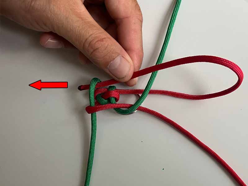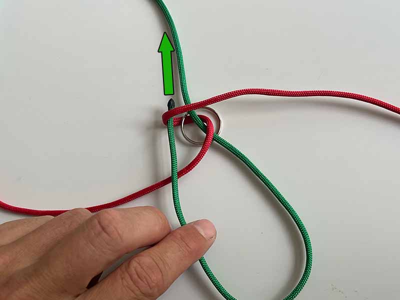 - Pak het onderste uiteinde van het groene touw en haal het omhoog naar links van zichzelf. Zorg ervoor dat het over het eerste rode touw gaat en door de rode lus zoals te zien in de afbeelding.