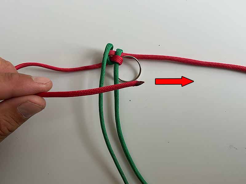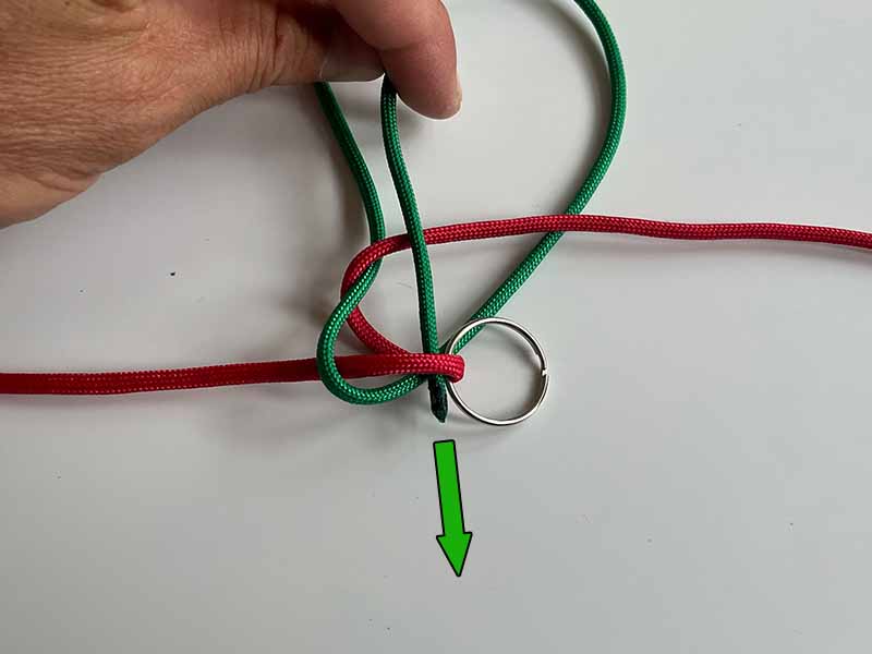 - Pak het rechter bovenste uiteinde van het groene touw en haal het naar beneden aan de rechterkant. Zorg er opnieuw voor dat het over het eerste rode touw gaat en door de rode touw zoals te zien in de afbeelding.