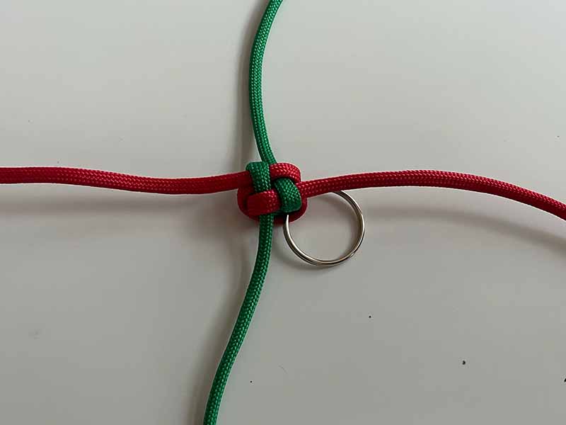 - Herhaal de vierkante knoop van de vorige stap totdat je niet genoeg touw over hebt voor nog een knoop.