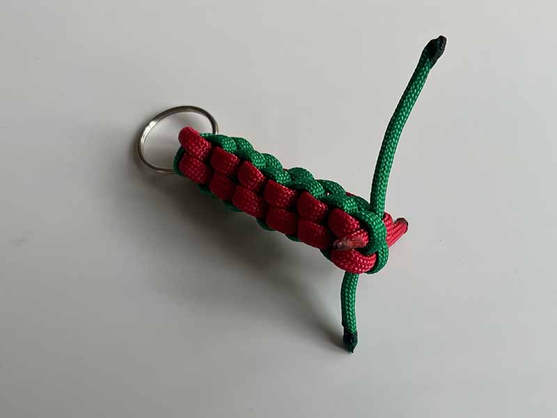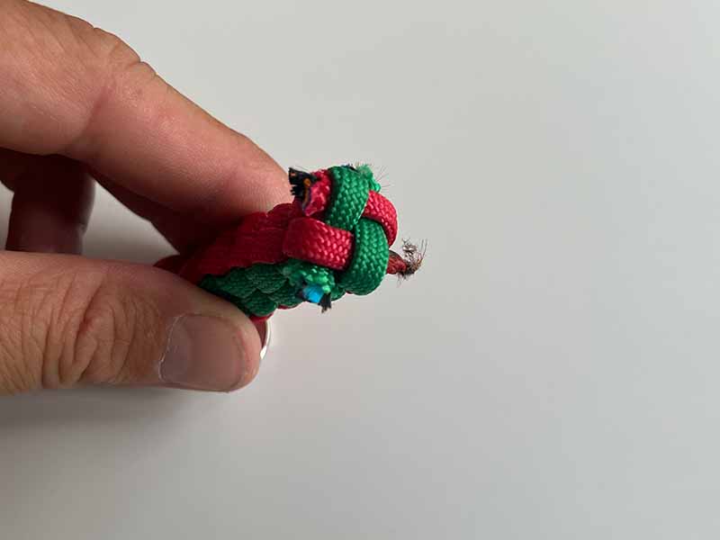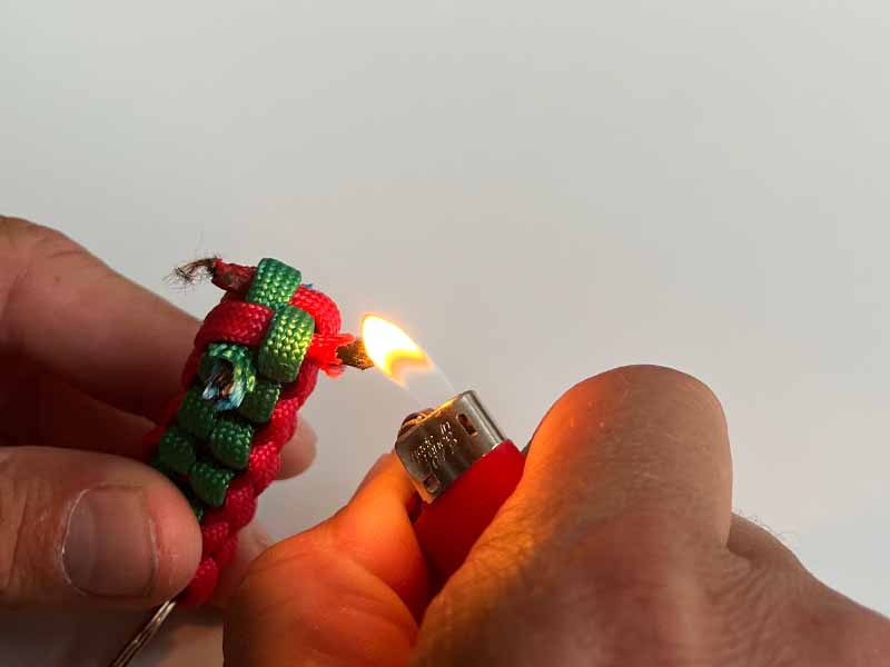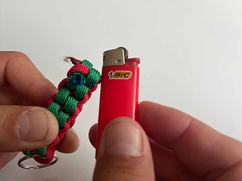 - Knip de lange overgebleven stukken touw af, zorg ervoor dat er een beetje overblijft om in de sleutelhanger te smelten.