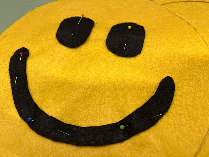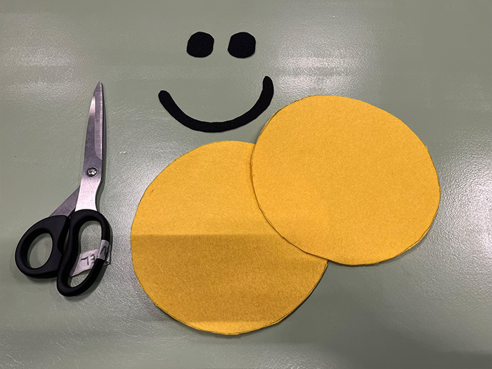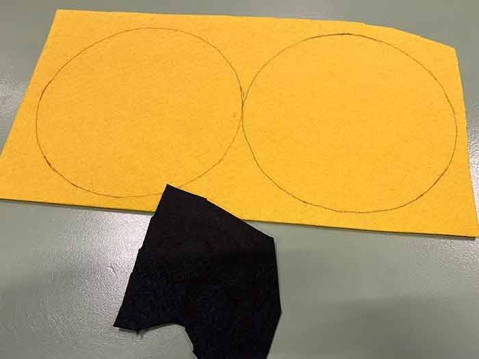 - Trek het sjabloon over op het vilt. Zorg ervoor dat je het gezicht op het gele vilt (2x) en de ogen (2x) en mond op het zwarte vilt overtrekt.